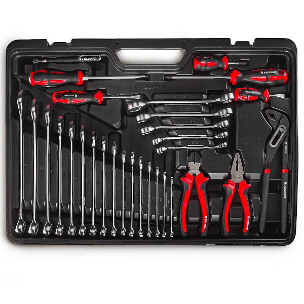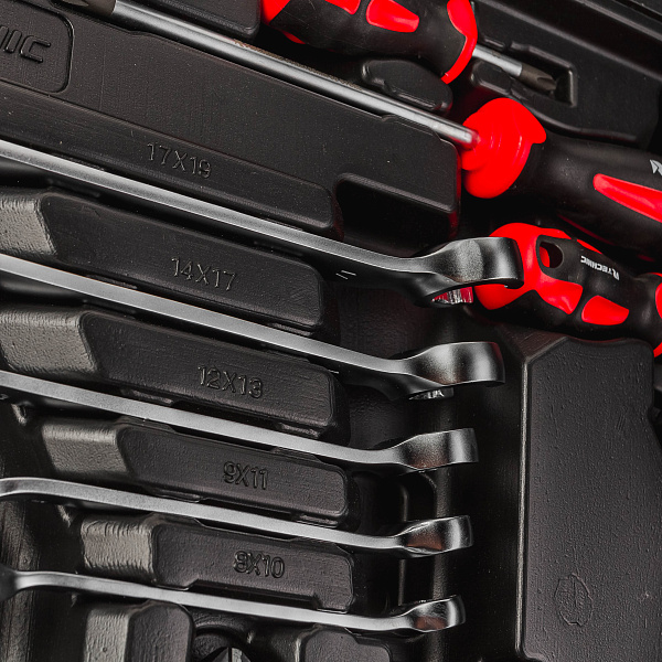 Набор включает в себя широкий диапазон размеров торцевых головок из 59 предметов, включая головки с Е-профилем, 3 свечные головки: 14, 16 и 21 мм, а также 16 комбинированных гаечных ключей с рабочими профилями 7 - 24 мм.