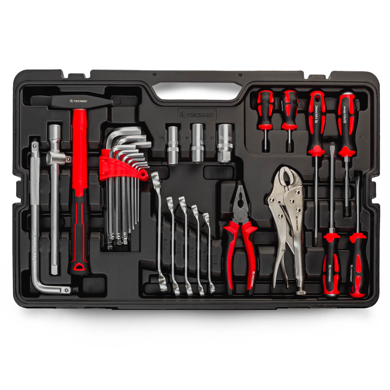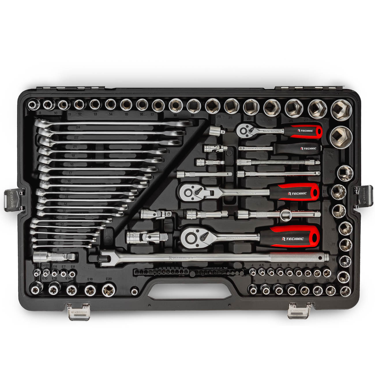 Набор включает в себя широкий диапазон размеров торцевых головок из 53 предметов, включая головки с Е-профилем, 3 свечные головки: 14, 16 и 21 мм, а также 17 комбинированных гаечных ключей с рабочими профилями 6 - 24 мм. Торцевые головки 1/2" и 1/4" — с 6-гранным рабочим профилем, 3/8" — с 12-гранным.