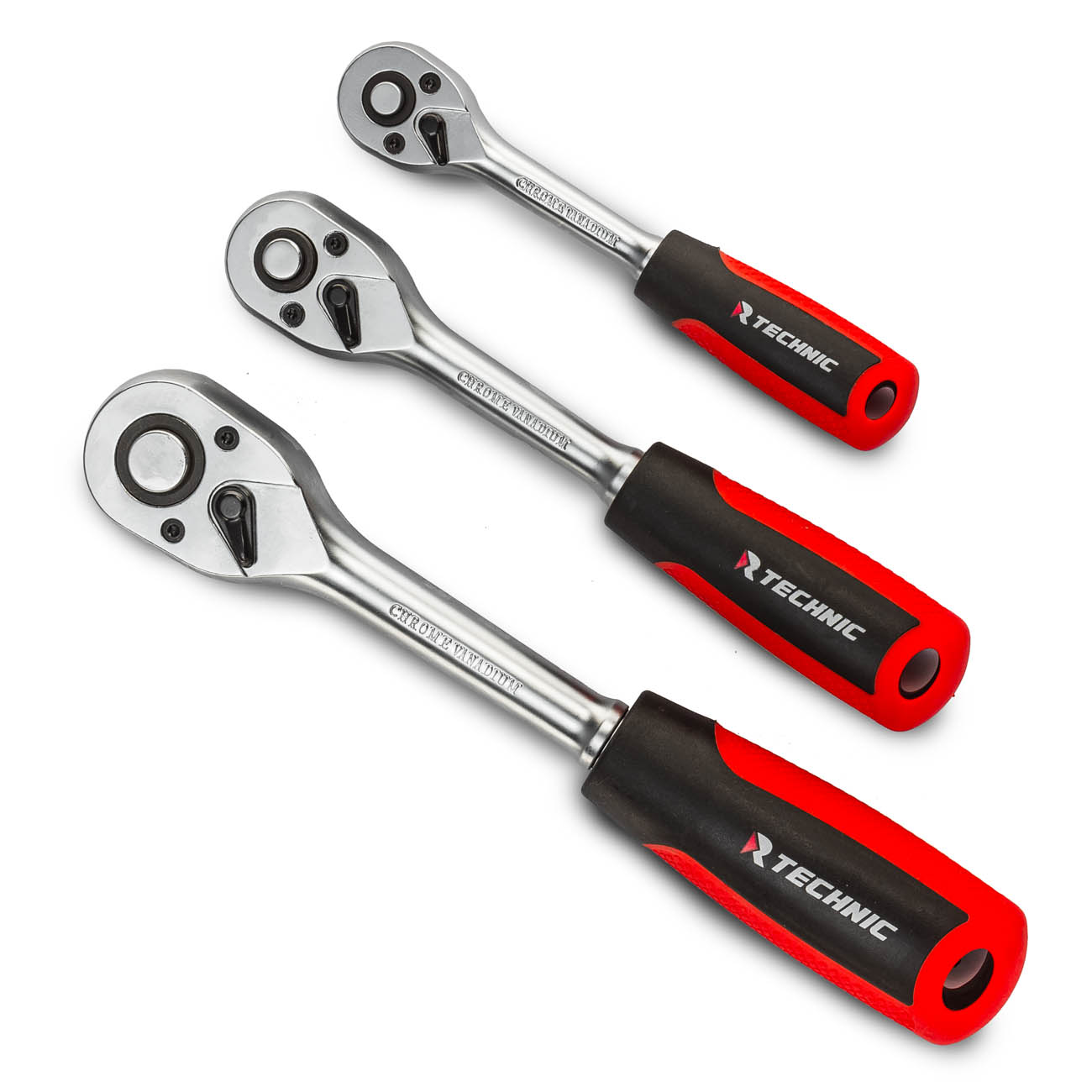 Трещотки оснащены надежным 45-зубцовым механизмом с храповым колесом из хромомолибденовой стали CrMo и двухкомпонентной маслобензостойкой ручкой.