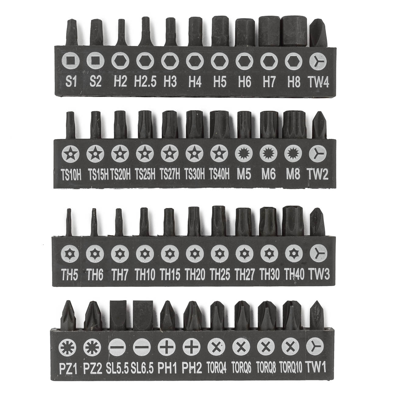 Биты ¼" 25 мм, SL: SL5.5 SL6.5. PH: РН1 РН2. PZ: PZ1 PZ2. HEX: H2 H2.5 H3 H4 H5 H6 H7 H8. SPLINE: M5 M6 M8. TORX ТR (TT): T5H T6H T7H T10H T15H T20H T25H T27H T30H T40H. TORX 5-STAR ТR: TS10H TS15H TS20H TS25H TS27H TS30H TS40H. TORQ SET: 4 6 8 10. TRI-WING: 1 2 3 4. SQUARE: S1, S2 - 44