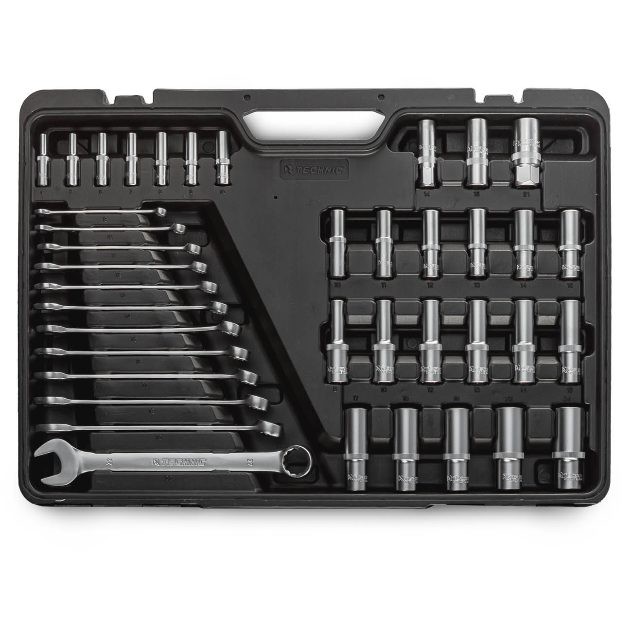 Набор включает в себя широкий диапазон размеров торцевых головок из 78 предметов, включая головки с Е-профилем, 3 свечные головки: 14, 16 и 21 мм, а также 12 комбинированных гаечных ключей с рабочими профилями 8 - 22 мм.