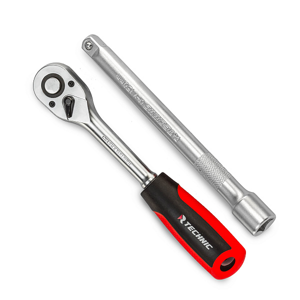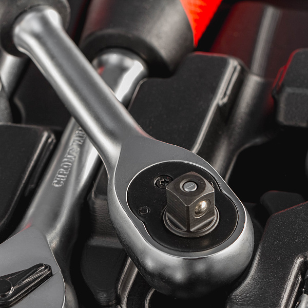 Трещотки оснащены надежным 45-зубцовым механизмом с храповым колесом из хромомолибденовой стали CrMo и двухкомпонентной маслобензостойкой ручкой.