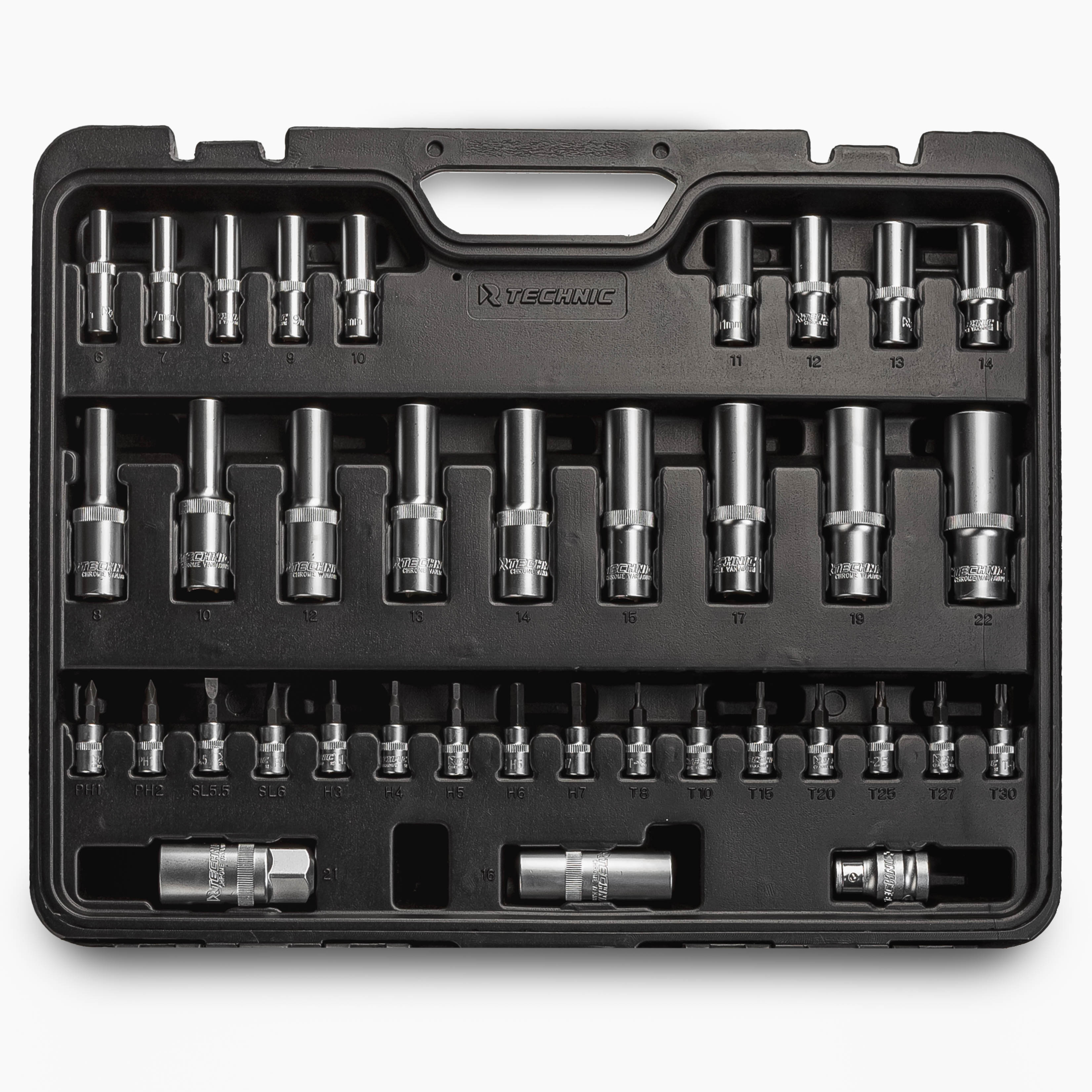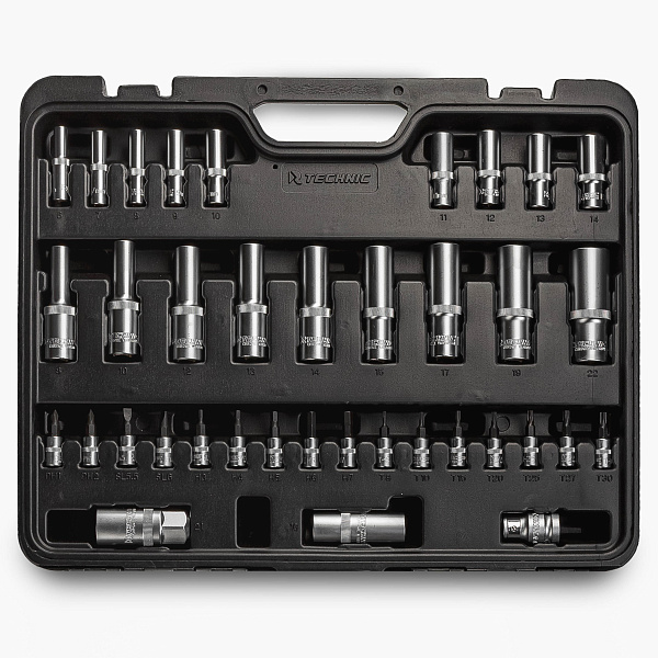 Набор включает в себя широкий диапазон размеров торцевых головок из 49 предметов, а также 2 свечные головки: 16 и 21 мм.