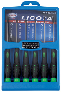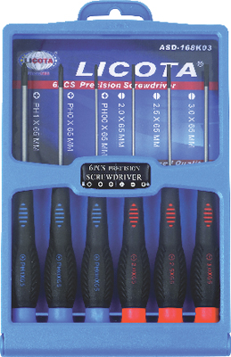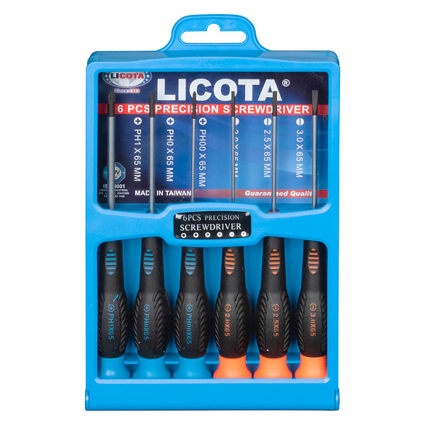 Набор отверток для точной механики Licota ASD-168K03. Комплект из 6 предметов: 3 отвертки с рабочим профилем SL (шлиц), 3 отвертки с рабочим профилем PH (крест). Длина жал - 65 мм.