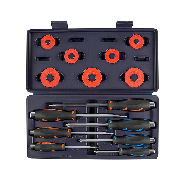 Набор отверток цельнометаллических Licota ASD-600K1 из 14 предметов. В комплект входят 4 отвертки с профилем SL (шлиц), 3 отвертки с профилем PH (крест) и 7 предохранительных колец для работы в паре с ударным инструментом.
