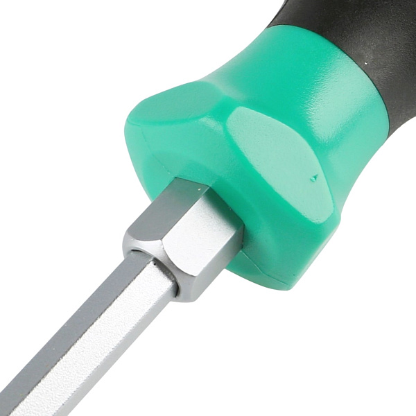Стержень отвертки проходит через всю рукоятку и заканчивается ударным затыльником. При откручивании “закисшего” или “прикипевшего” крепежа это позволяет дополнительно прикладывать небольшие ударные нагрузки. Шестигранник между стержнем и рукояткой дает возможность использовать гаечный ключ для увеличения крутящего момента.