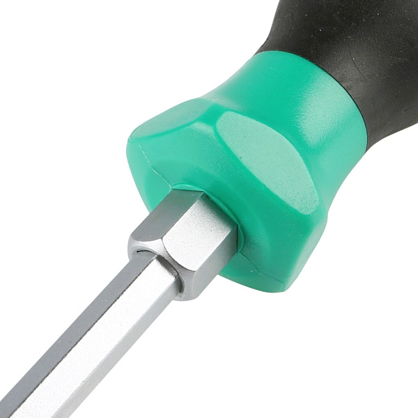 Стержень отвертки проходит через всю рукоятку и заканчивается ударным затыльником. При откручивании “закисшего” или “прикипевшего” крепежа это позволяет дополнительно прикладывать небольшие ударные нагрузки. Шестигранник между стержнем и рукояткой дает возможность использовать гаечный ключ для увеличения крутящего момента.
