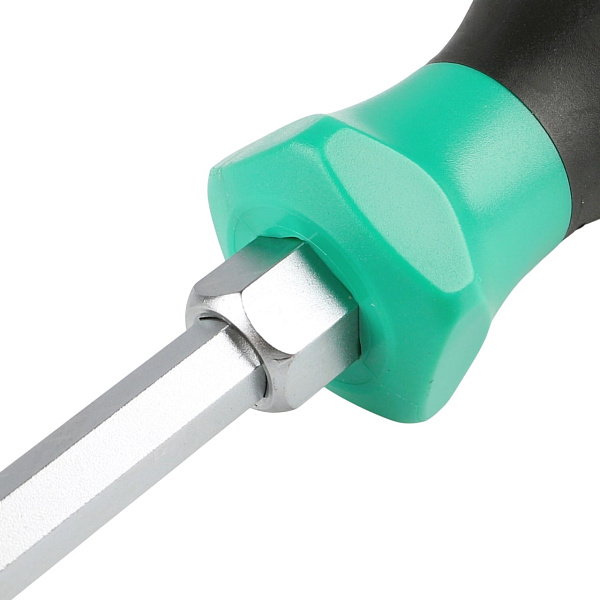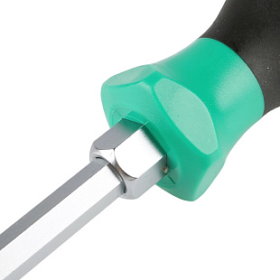 Стержень отвертки проходит через всю рукоятку и заканчивается ударным затыльником. При откручивании “закисшего” или “прикипевшего” крепежа это позволяет дополнительно прикладывать небольшие ударные нагрузки. Шестигранник между стержнем и рукояткой дает возможность использовать гаечный ключ для увеличения крутящего момента.
