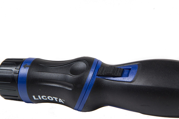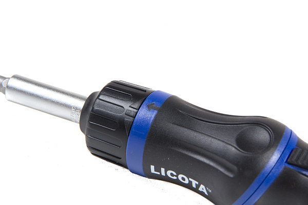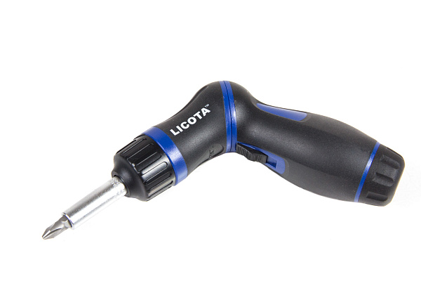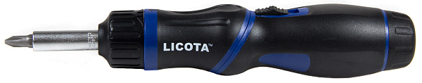 Отвертка трещоточная с поворотной ручкой и сменными битами Licota ARD-12K04. Длина инструмента - 198 мм, рабочий профиль бит - PH (крест), SL (шлиц).