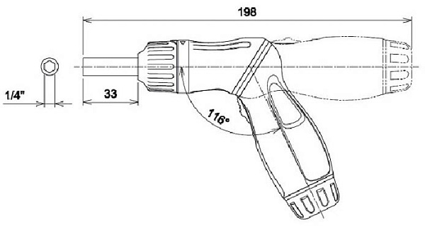 Поворотная ручка с углом поворота 116° позволяет держать инструмент как шуруповерт, обеспечивая повышенный крутящий момент и комфортную работу в труднодоступных местах. Встроенный храповый механизм дает легкость и высокую скорость проведения работ даже одной рукой, не требуя переставления инструмента на крепеже.