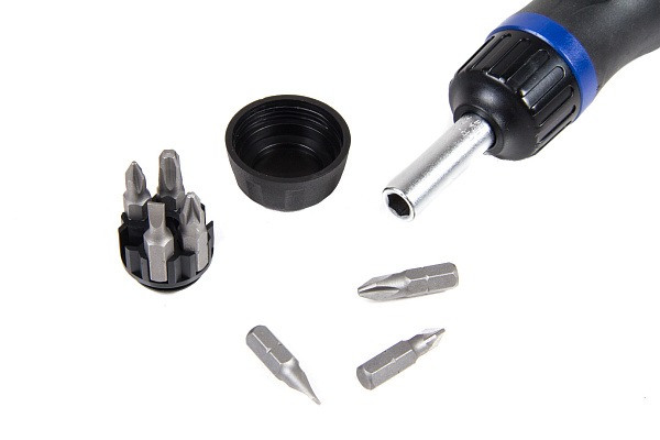 Пластиковый корпус отвертки служит также футляром для сменных бит, предохраняя их от потери или поломки.