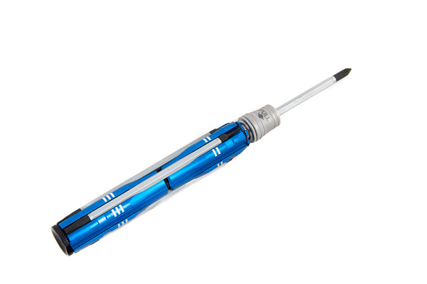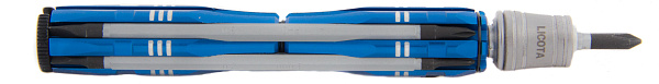 Корпус отвертки одновременно служит футляром-держателем для сменных жал, предохраняя их от потери или поломки.
