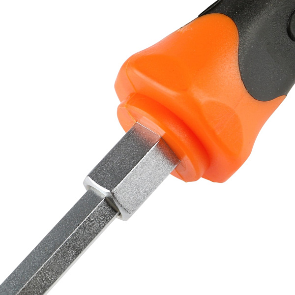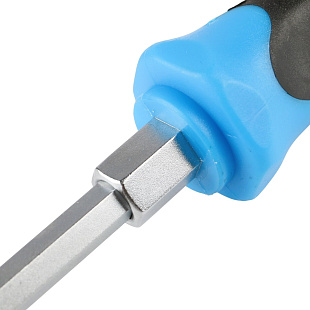 Стержень отвертки проходит через всю рукоятку и заканчивается ударным затыльником. При откручивании “закисшего” или “прикипевшего” крепежа это позволяет дополнительно прикладывать небольшие ударные нагрузки. Шестигранник между стержнем и рукояткой дает возможность использовать гаечный ключ для увеличения крутящего момента.