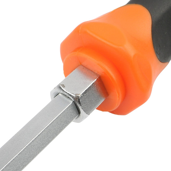 Стержень отвертки проходит через всю рукоятку и заканчивается ударным затыльником. При откручивании “закисшего” или “прикипевшего” крепежа это позволяет дополнительно прикладывать небольшие ударные нагрузки. Шестигранник между стержнем и рукояткой дает возможность использовать гаечный ключ для увеличения крутящего момента.