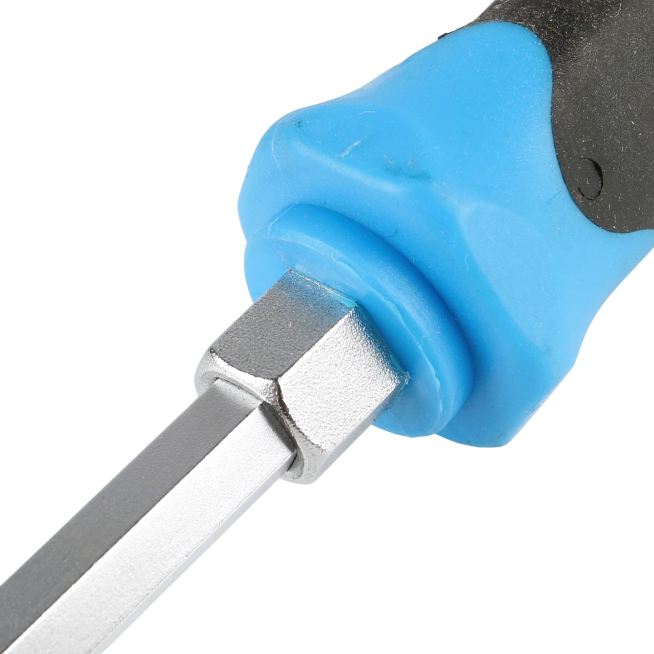 Усиленная конструкция с шестигранным профилем жала и приводом под ключ у его основания позволяет прикладывать дополнительное усилие при закручивании-откручивании крепежа.