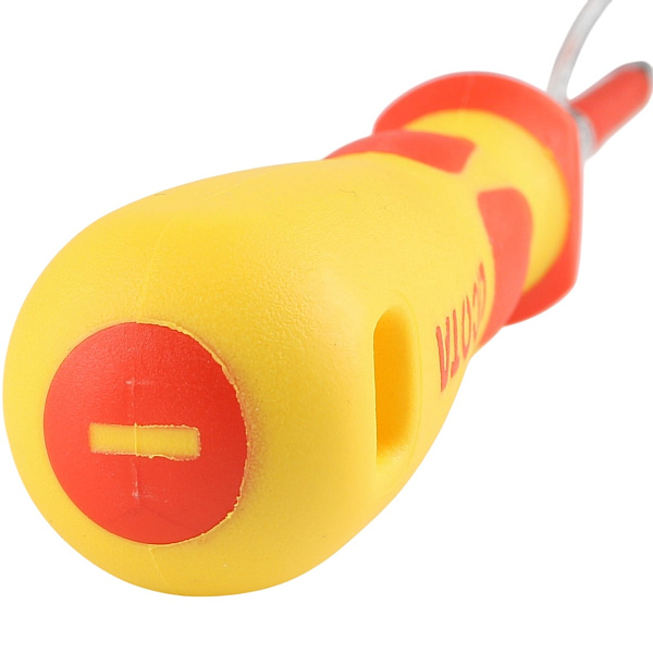 Шток отвертки защищен изолирующим покрытием. Допускается для производства слесарно-монтажных работ в электроустановках до 1000 В. Изоляция диэлектрического инструмента проверена согласно DIN 7437 в специальной среде (электролит) при напряжении в 10 000 В.