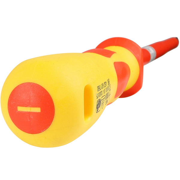 Шток отвертки защищен изолирующим покрытием. Допускается для производства слесарно-монтажных работ в электроустановках до 1000 В. Изоляция диэлектрического инструмента проверена согласно DIN 7437 в специальной среде (электролит) при напряжении в 10 000 В.