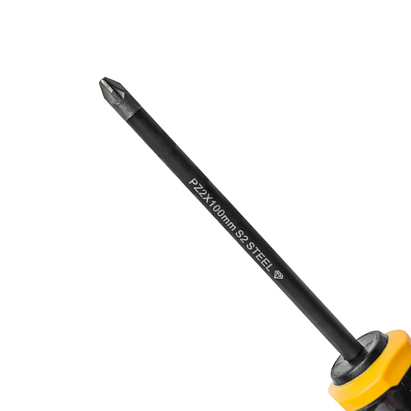 Фосфатированный стержень из инструментальной стали S2, закаленной до 57-61 HRC, обеспечивает износостойкость инструмента даже при интенсивном использовании. Фосфатирование наконечника повышает сцепление с шлицем крепежа и устойчивость к коррозии. Также наконечник намагничен для дополнительного удержания крепежа.
