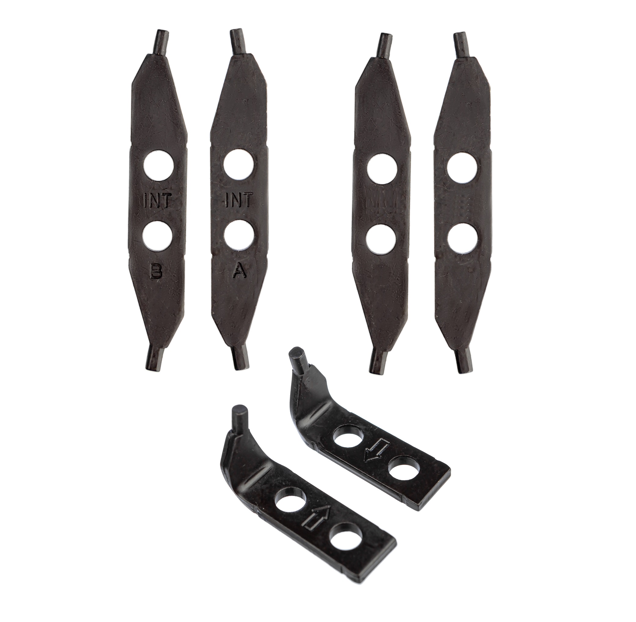 - пара двусторонних изогнутых под 90 градусов сменных губок с наконечниками 3,2 мм, для работы с внутренними/внешними стопорными кольцами наконечники меняются местами