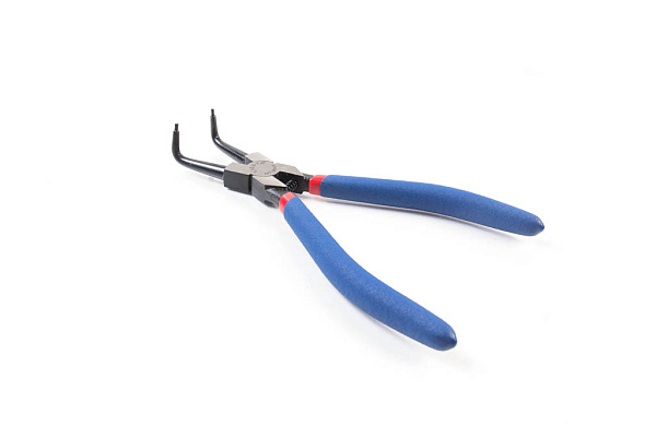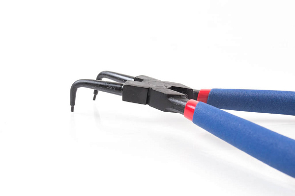 Съемник внутренних стопорных колец, загнутый Licota APT-38002B из хром-ванадиевой стали и ручками из эргономичного нескользящего полимера. Съемник работает на сжим. Длина инструмента - 180 мм.