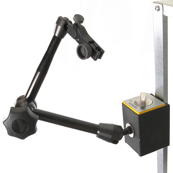 Механический магнитный измерительный штатив с механической фиксацией из одной точки. Все три сочленения зажимаются одной поворотной рукояткой. Зажимное усилие плавно и надежно регулируется. Шаровые шарниры обеспечивают быстрое и простое позиционирование.