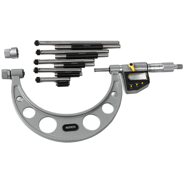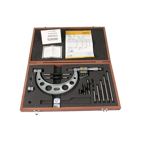 Микрометр для больших измерений цифровой со сменными штифтами Asimeto 115-04-6-П - универсальный прибор для измерений линейных размеров абсолютным или относительным контактным методом с низкой погрешностью. Преобразовательным механизмом является микропара “винт - гайка”.
