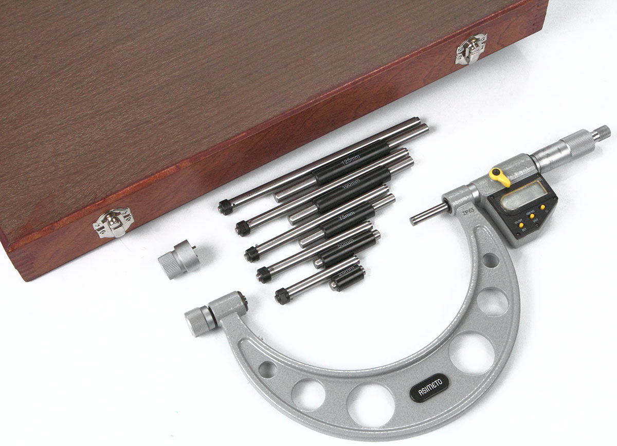 Микрометр для больших измерений цифровой со сменными штифтами Asimeto 115-06-0 - универсальный прибор для измерений линейных размеров абсолютным или относительным контактным методом с низкой погрешностью. Преобразовательным механизмом является микропара “винт - гайка”.
