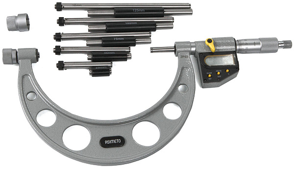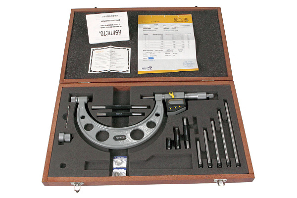 Микрометр для больших измерений цифровой со сменными штифтами Asimeto 115-08-6 - универсальный прибор для измерений линейных размеров абсолютным или относительным контактным методом с низкой погрешностью. Преобразовательным механизмом является микропара “винт - гайка”.