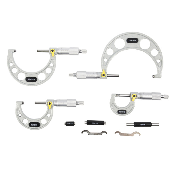 Набор микрометров гладких механических для наружных измерений со скобой Asimeto 101-64-8 - комплект из 4 приборов для измерений линейных размеров абсолютным или относительным контактным методом с низкой погрешностью в области малых размеров. Преобразовательным механизмом является микропара “винт - гайка”.