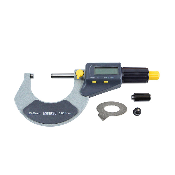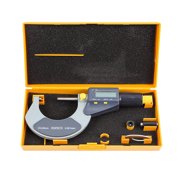 Микрометр гладкий цифровой для наружных измерений Asimeto 116-01-0 - универсальный прибор для измерений линейных размеров абсолютным или относительным контактным методом с низкой погрешностью в области малых размеров. Преобразовательным механизмом является микропара “винт - гайка”.