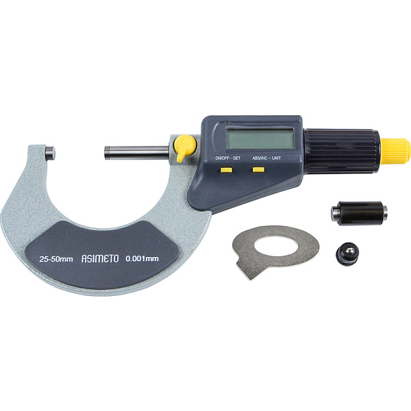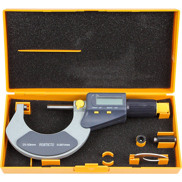 Микрометр гладкий цифровой для наружных измерений Asimeto 116-03-0-П - универсальный прибор для измерений линейных размеров абсолютным или относительным контактным методом с низкой погрешностью в области малых размеров. Преобразовательным механизмом является микропара “винт - гайка”.