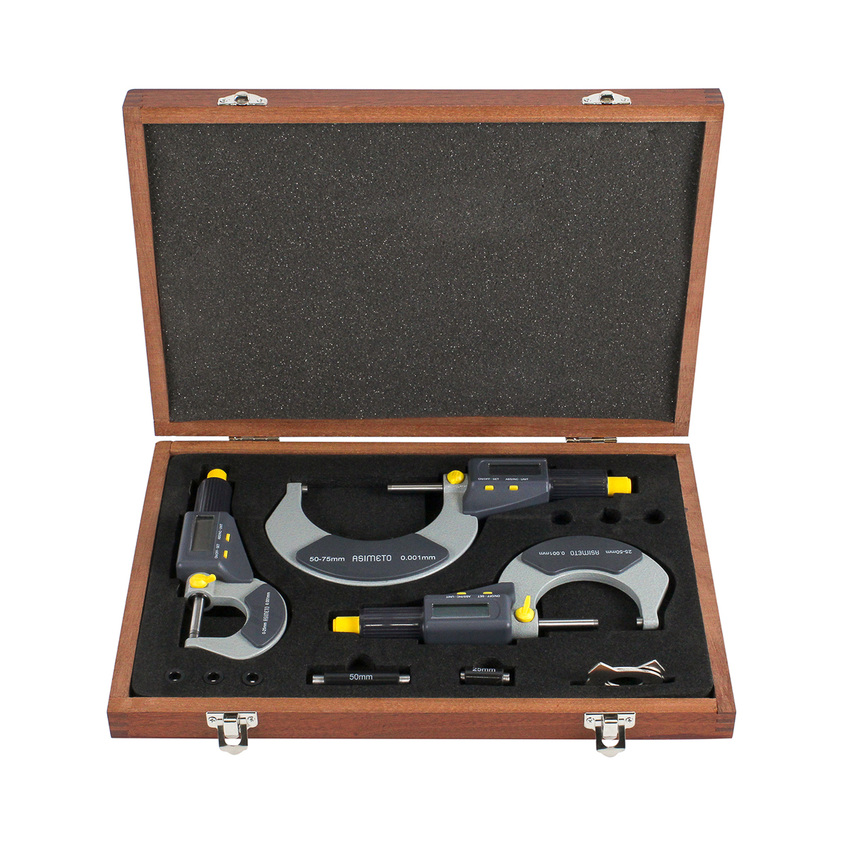Набор микрометров гладких цифровых для наружных измерений Asimeto 116-63-0- универсальный комплект из 3 приборов для измерений линейных размеров абсолютным или относительным контактным методом с низкой погрешностью в области малых размеров. Преобразовательным механизмом является микропара “винт - гайка”.