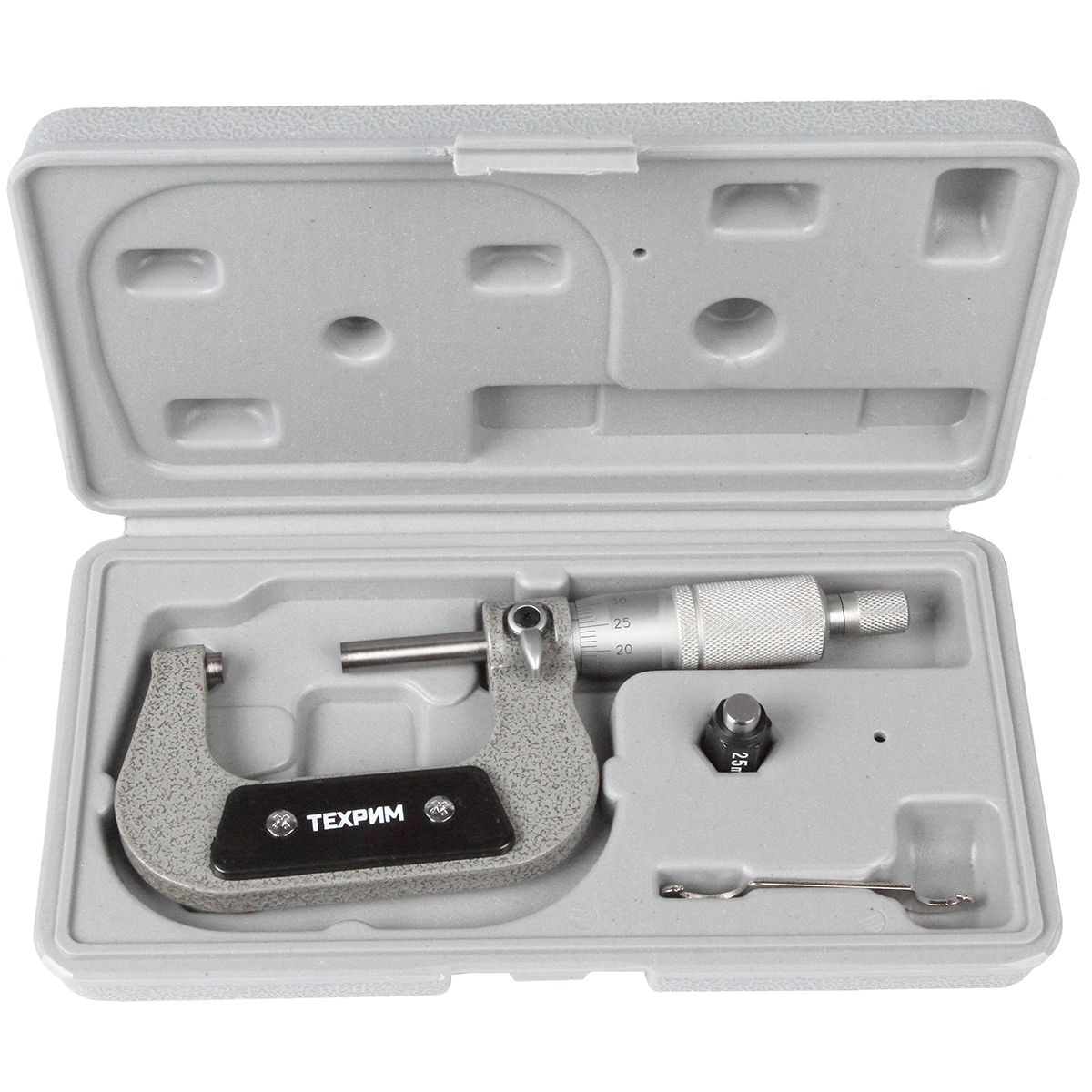 Микрометр гладкий механический для наружных измерений ТЕХРИМ T050006 - универсальный прибор для измерений линейных размеров абсолютным или относительным контактным методом с низкой погрешностью в области малых размеров. Преобразовательным механизмом является микропара “винт - гайка”.