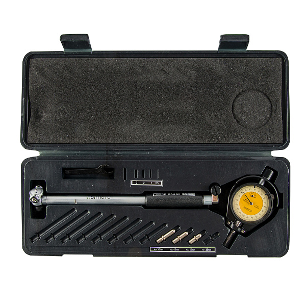 Комплект из 9 предметов в пластиковом футляре позволяет производить замеры в труднодоступных местах. Диапазон измерений 35-50 мм.