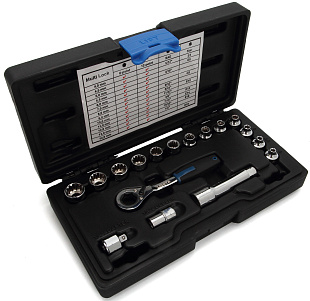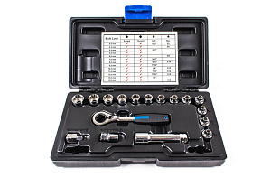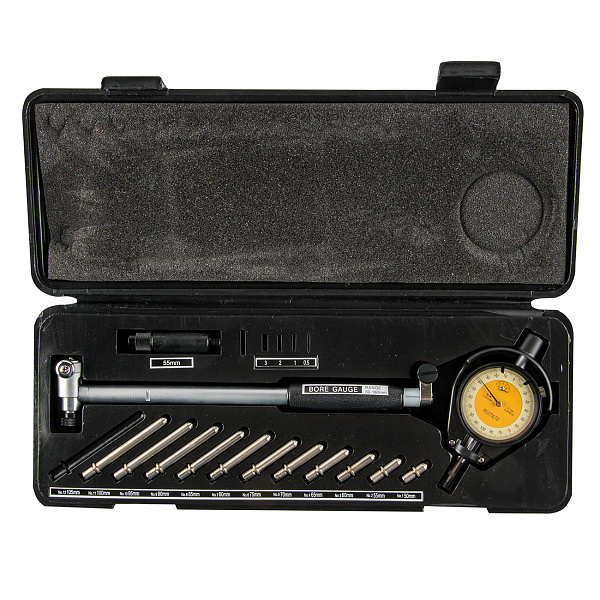Комплект из 18 предметов в пластиковом футляре позволяет производить замеры в труднодоступных местах. Диапазон измерений 50-160 мм.