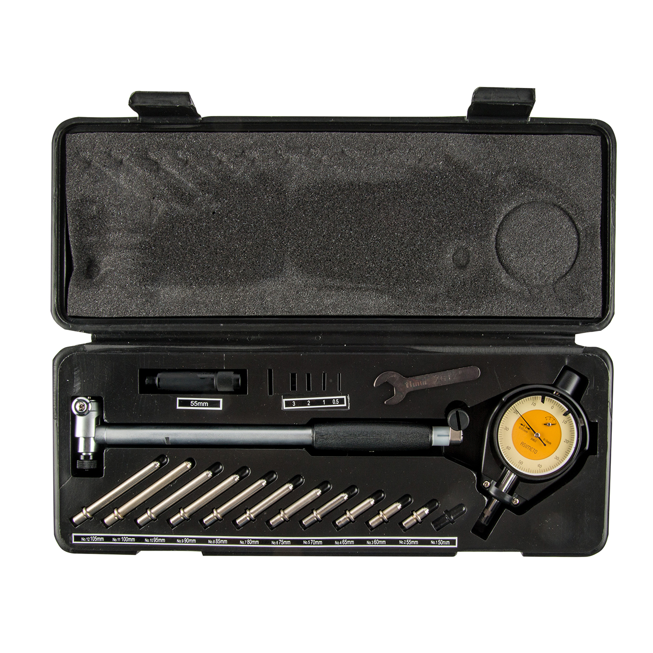 Комплект из 18 предметов в пластиковом футляре позволяет производить замеры в труднодоступных местах. Диапазон измерений 50-160 мм.