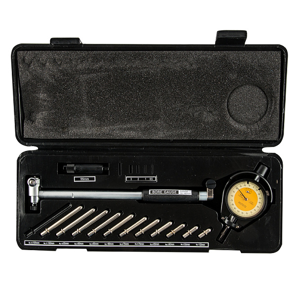 Комплект из 18 предметов в пластиковом футляре позволяет производить замеры в труднодоступных местах. Диапазон измерений 50-160 мм.