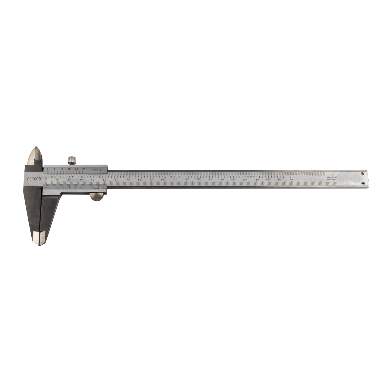Штангенциркуль нониусный ASIMETO 0341-08-04 серии 341 из нержавеющей стали с губками для внутренних и наружных замеров и плоским глубиномером. Предназначен для измерения линейных размеров малогабаритных деталей.