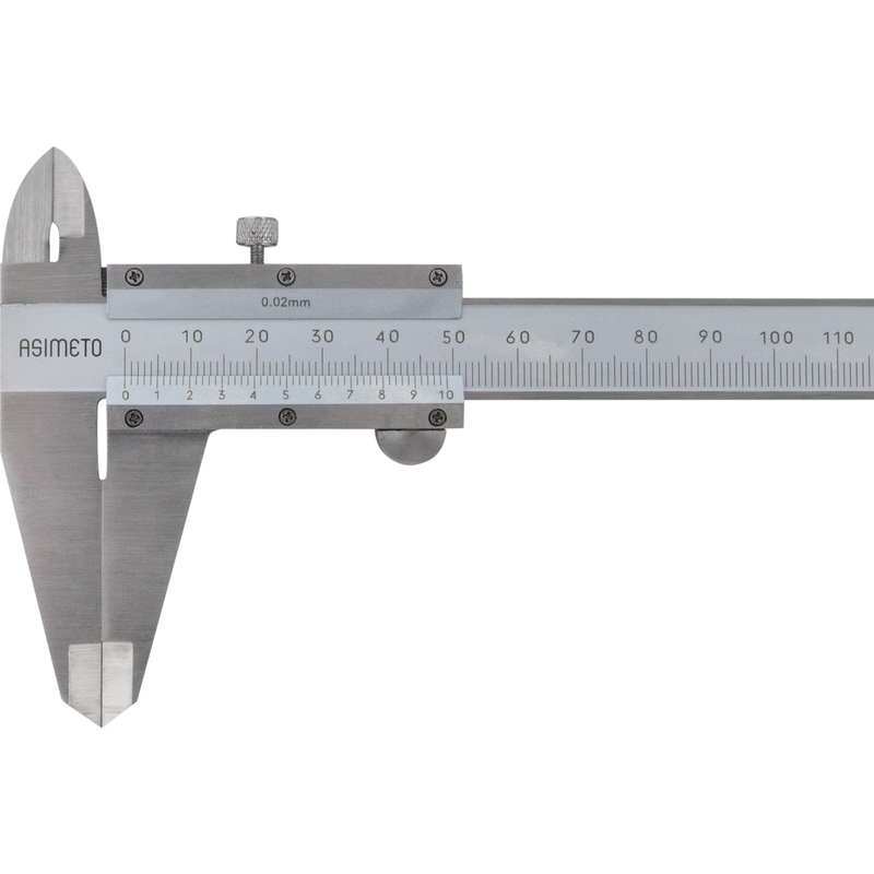 Штангенциркуль нониусный ASIMETO 343-06-4-П серии 343 из нержавеющей стали с губками для внутренних и наружных замеров и плоским глубиномером. Предназначен для измерения линейных размеров малогабаритных деталей.