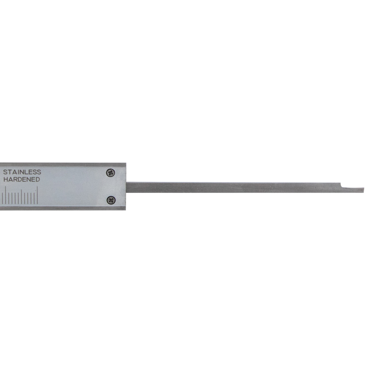 Матовое хромирование основной шкалы и нониуса обеспечивает высокий результат считывания. Плоский глубиномер позволяет измерить глубину отверстий диаметром от 2 мм.