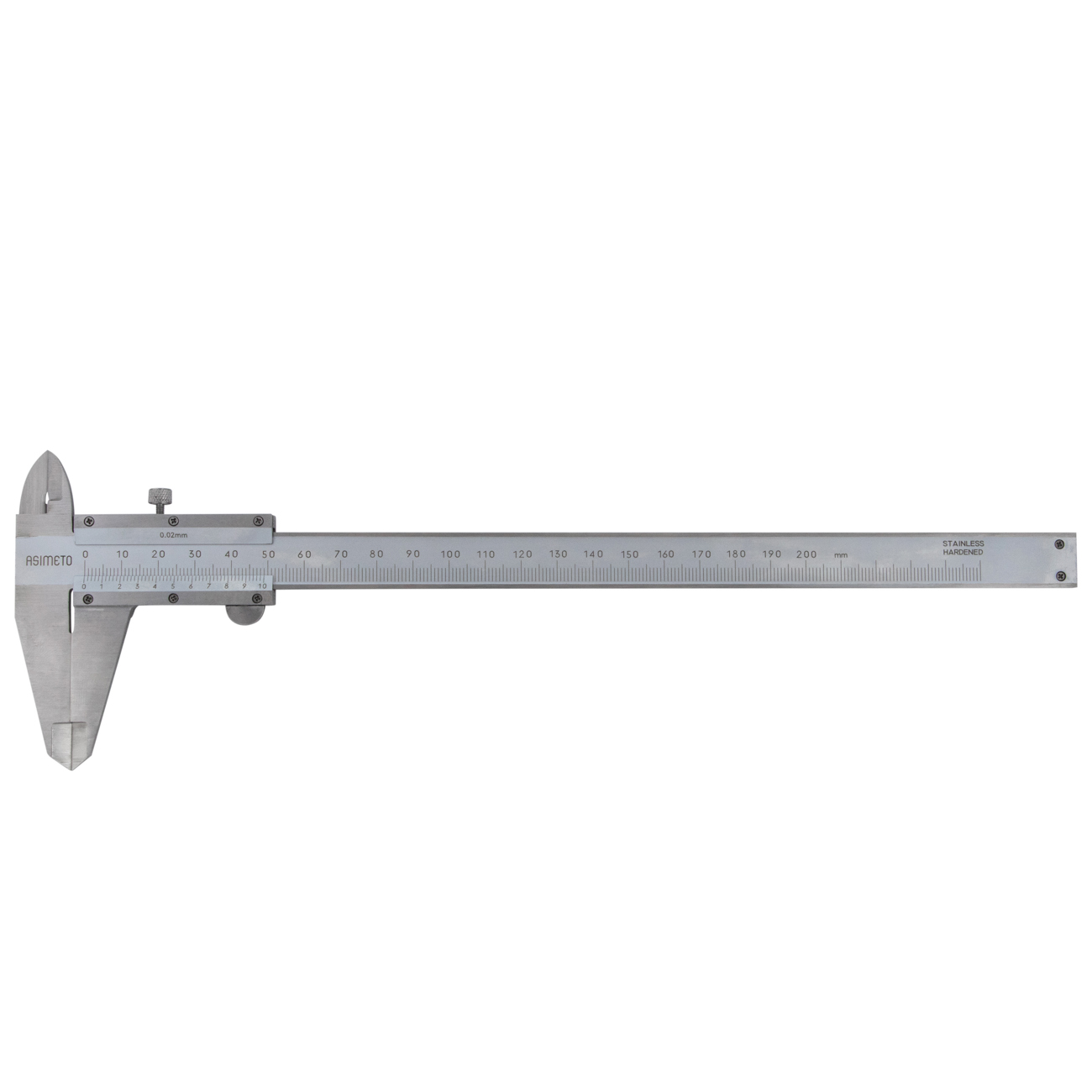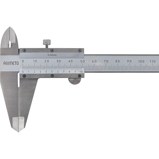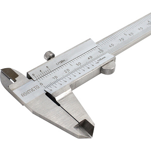 Штангенциркуль нониусный ASIMETO 0343-06-04 серии 343 из нержавеющей стали с губками для внутренних и наружных замеров и плоским глубиномером. Предназначен для измерения линейных размеров малогабаритных деталей.