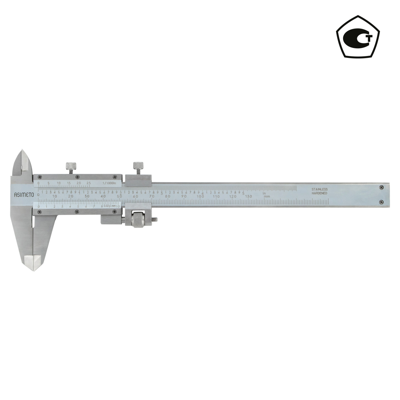Штангенциркуль нониусный ASIMETO 0363-05-06 серии 363 из нержавеющей стали с губками для внутренних и наружных замеров и плоским глубиномером. Предназначен для измерения линейных размеров малогабаритных деталей.