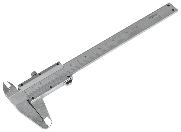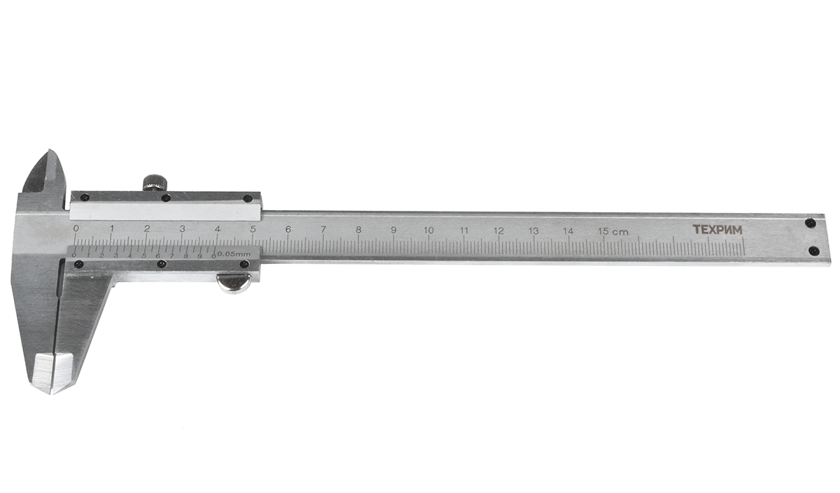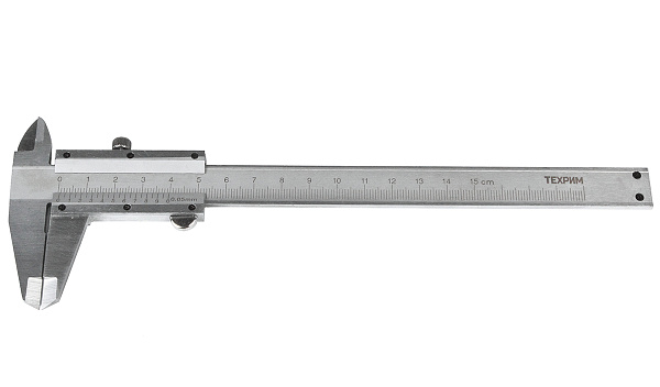 Штангенциркуль нониусный ТЕХРИМ T050015 из углеродистой стали с губками для внутренних и наружных замеров. Предназначен для измерения линейных размеров деталей.