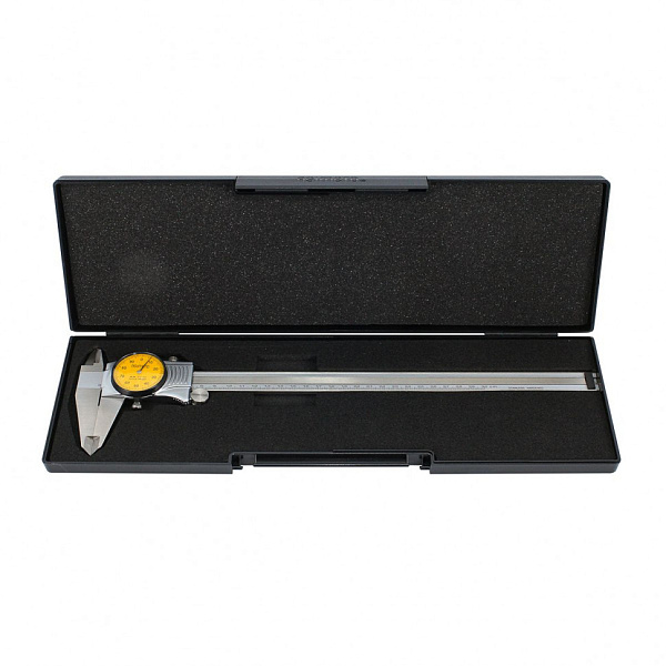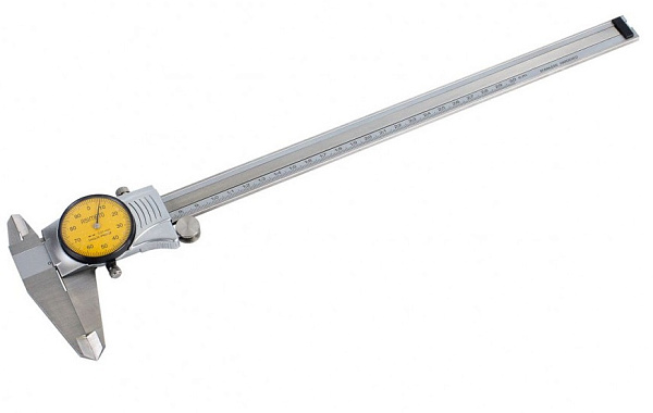 Данаая модель штангенциркуля с циферблатом имеет губки для внутренних и наружных замеров и плоский глубиномер. Рамка и циферблат имеют стопорные механизмы.