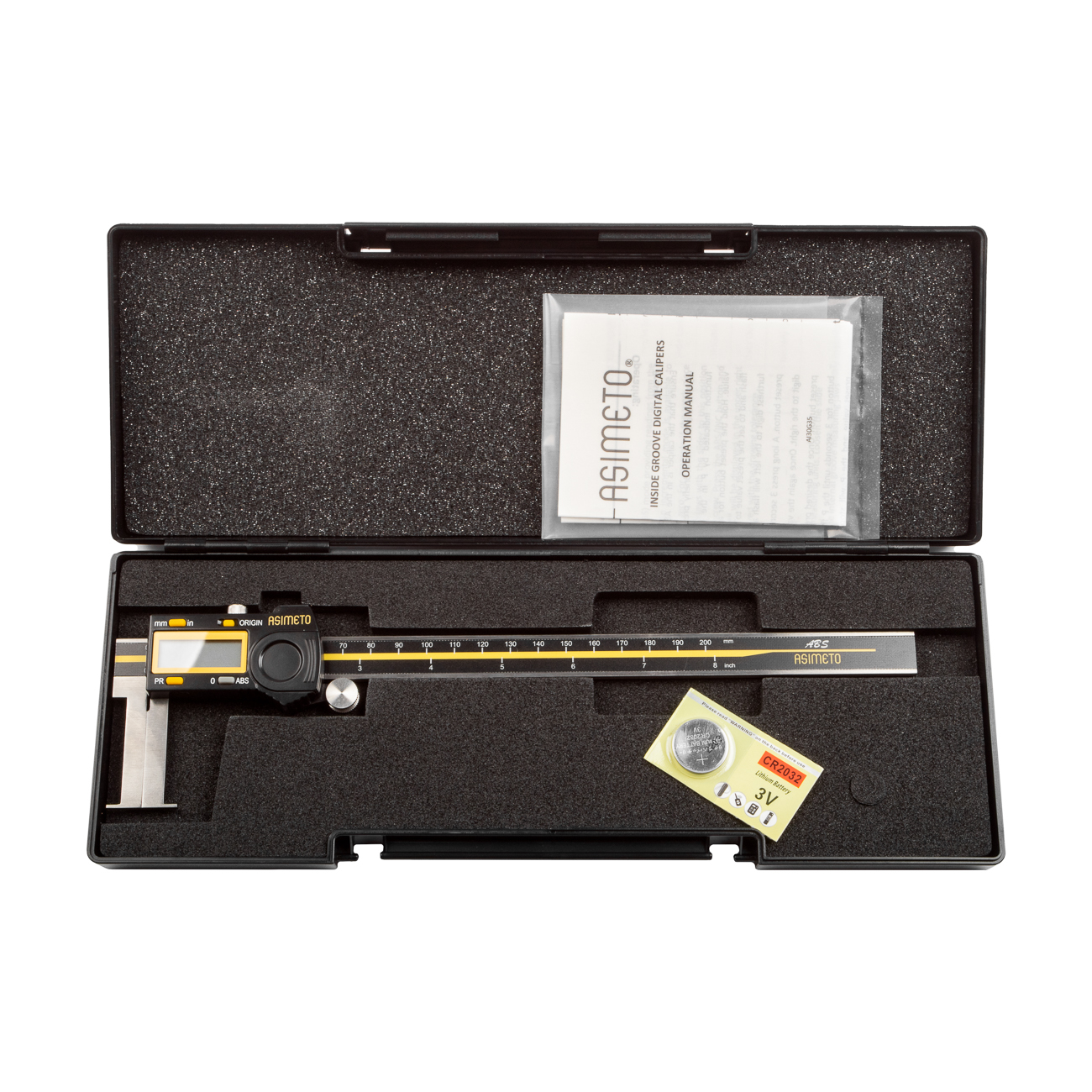 Цифровой штангенциркуль ASIMETO 309-08-4 для измерения внутренних канавок. При работе с цифровыми штангенциркулями результат измерений отображается на дисплее.