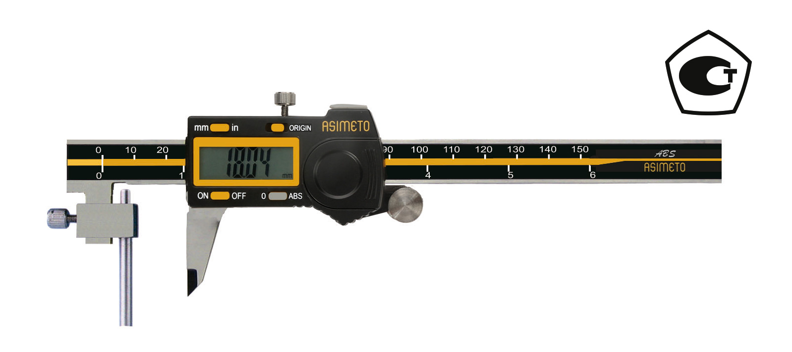 Цифровой штангенциркуль ASIMETO 316-08-2-П для измерения толщины стенок труб. При работе с цифровыми штангенциркулями результат измерений отображается на дисплее.