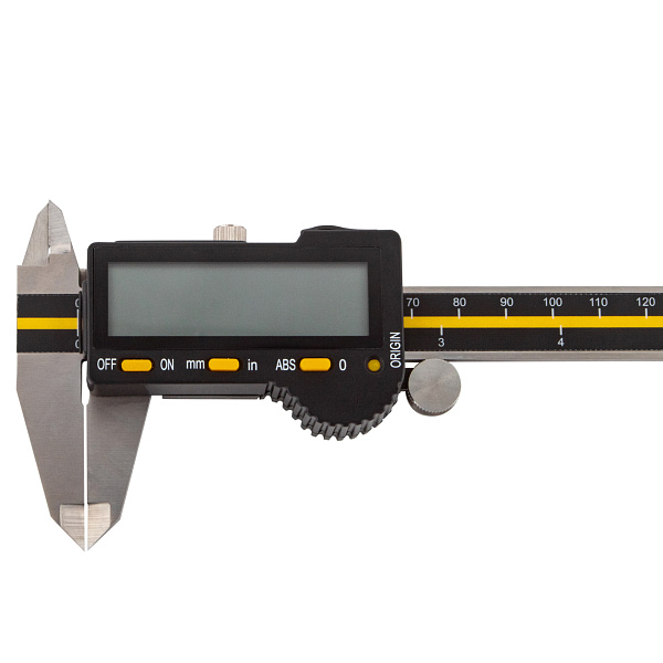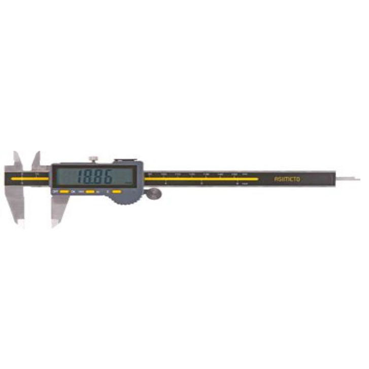 Цифровой штангенциркуль ASIMETO 306-12-3 для измерения наружных и внутренних размеров. При работе с цифровыми штангенциркулями результат измерений отображается на дисплее. Инструмент используют, когда данные необходимо получить быстро, без расчёта дополнительных шкал.