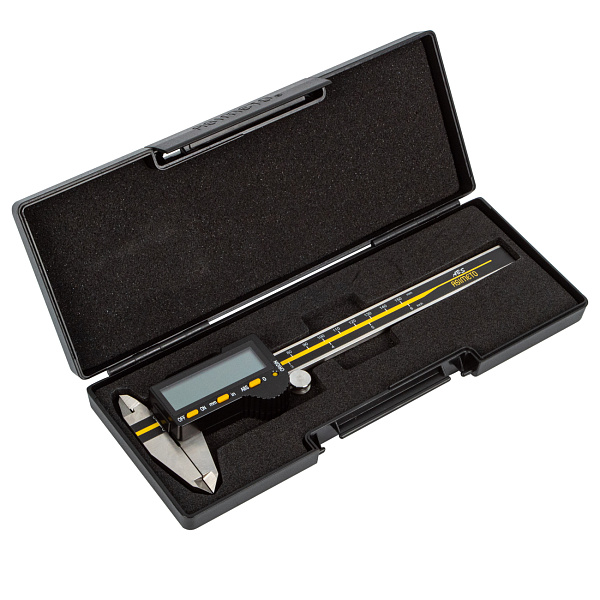 Штангенциркуль электронный ASIMETO 306-12-3 для измерения наружных и внутренних размеров. При работе с цифровыми штангенциркулями результат измерений отображается на дисплее. Инструмент используют, когда данные необходимо получить быстро, без расчёта дополнительных шкал.
