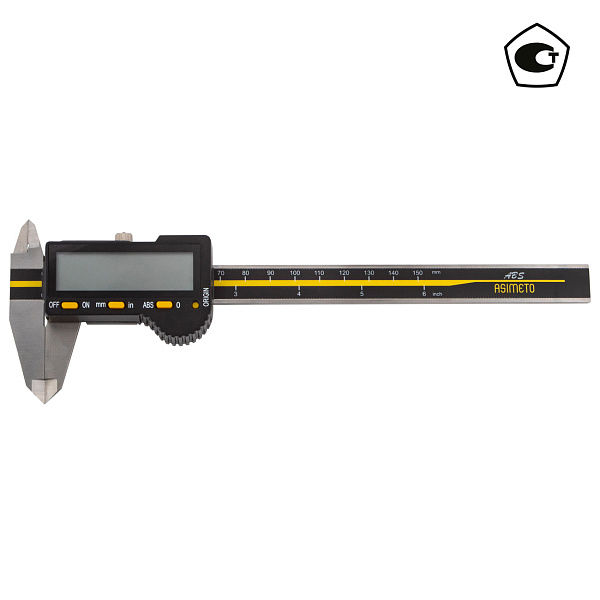 Цифровой штангенциркуль ASIMETO 306-12-4 для измерения наружных и внутренних размеров. При работе с цифровыми штангенциркулями результат измерений отображается на дисплее. Инструмент используют, когда данные необходимо получить быстро, без расчёта дополнительных шкал.