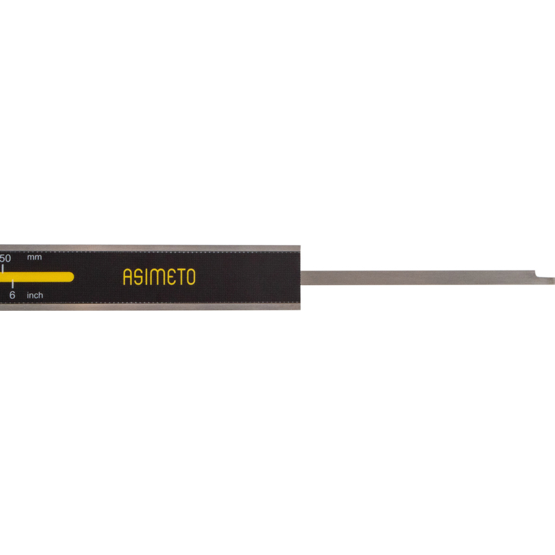 Цифровой штангенциркуль ASIMETO 306-12-5-П для измерения наружных и внутренних размеров. При работе с цифровыми штангенциркулями результат измерений отображается на дисплее. Инструмент используют, когда данные необходимо получить быстро, без расчёта дополнительных шкал.